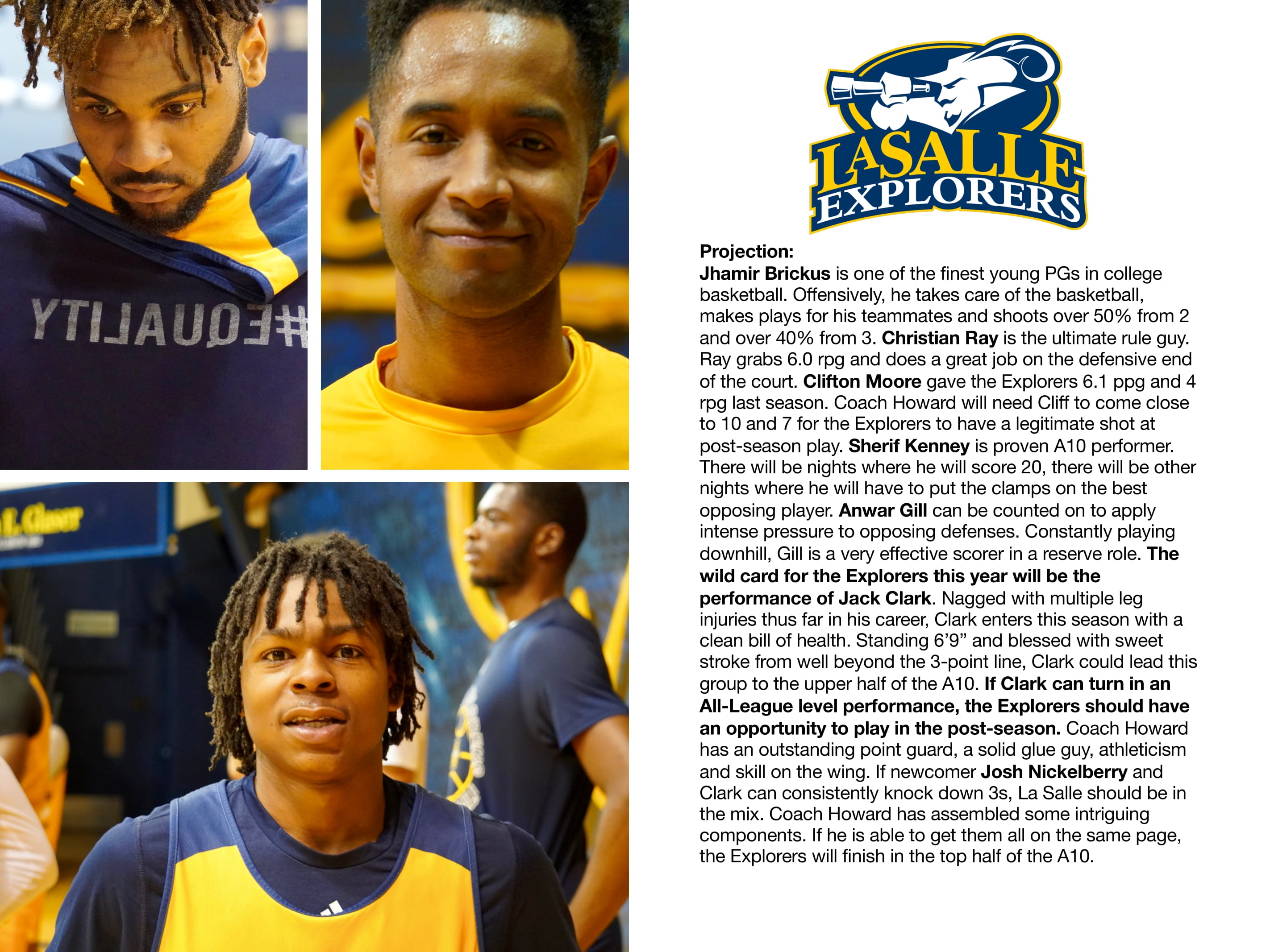 What should be expected of the La Salle program? The Explorers should expect to finish in the top 4 of the A10 every year. They should play in the NCAA tournament 1 out of every 4 or 5 years. Howard’s predecessor, John Giannini led the Explorers to one NCAA and one NIT appearance in 14 years. If Jack Clark performs at an All-A10 level, La Salle will be competitive during the A10 regulars season and a tough out in the A10 tournament. A strong showing and a post-season appearance would be timely as some in the La Salle fanbase are getting restless.