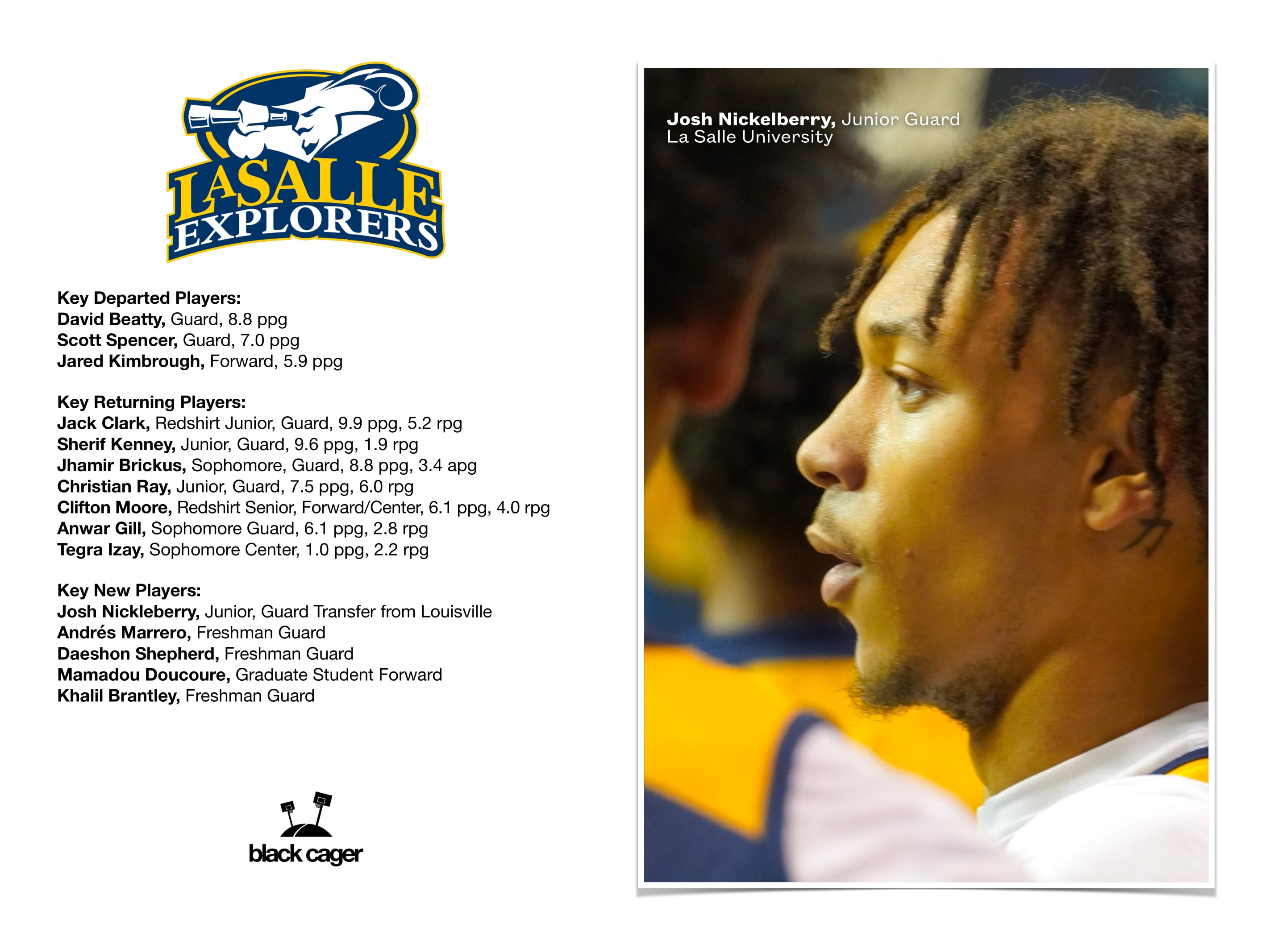Louisville transfer Josh Nickelberry finished his high school career with 2,904 points, making him the second-leading all-time scorer in the history of North Carolina high school basketball. He averaged 26.9 points, 4.9 rebounds and 2.6 assists per game as a senior, leading his team to a 20-14 record and a runner-up position in the 1A NCISAA North Carolina state championship. Last season, Sherif Kenney was first player in La Salle history to be named A-10 Sixth Man of Year. Kenney saw action in 24 games, with 10 starts. He was second on the team in scoring (9.6 ppg), assists (41), and steals (25). A capable offensive player, he had 11 games in which he reached double figures.